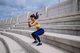Se trata de bajar los glúteos como si fueras a sentarte… pero sin silla. Coloca los pies a la altura de las caderas y comienza el ejercicio. El abdomen ha de estar activado y las rodillas no deben sobrepasar las puntas de los pies. Al realizarlas vigila no forzar la curvatura lumbar. ¡Un ejercicio perfecto para perder peso en casa o en cualquier lugar!